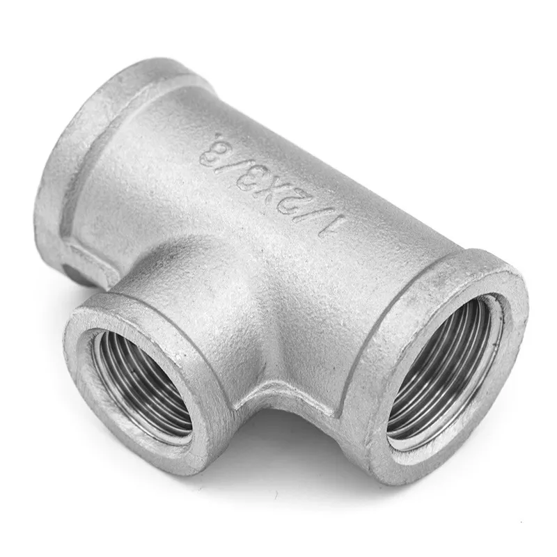 3-way female gas threaded reduced tee, cast in 316 stainless steel, for industrial threaded piping.