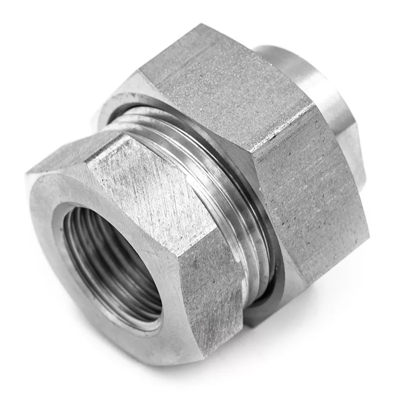 3-piece union consisting of 2 female threaded pieces (gas thread NFE 03-005), a hexagonal lock nut and a flat PTFE seal.