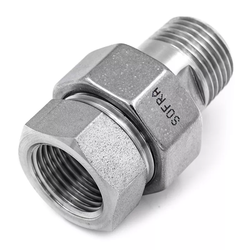 3-piece union consisting of a male threaded part (gas thread), a female threaded part, an octagonal clamping nut and a PTFE flat seal.