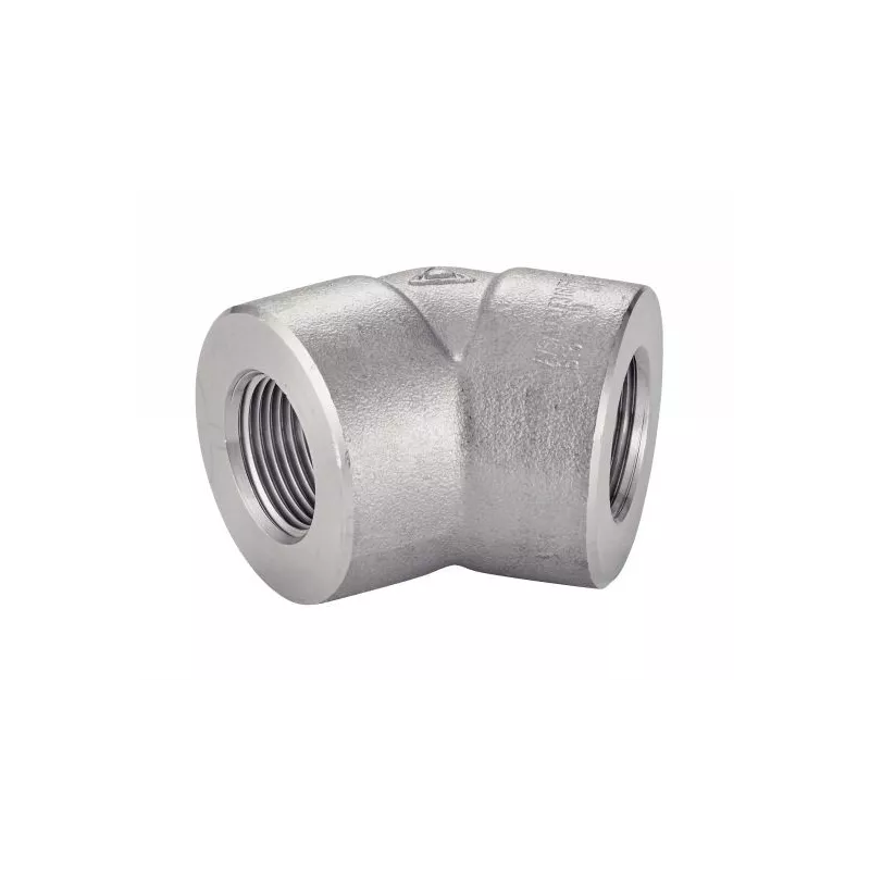 Coude femelle-femelle à 45°, fabriqué en inox 316L, à filetage NPT, compatible avec les tuyauteries 3000 LBS utilisées dans l'industrie.
