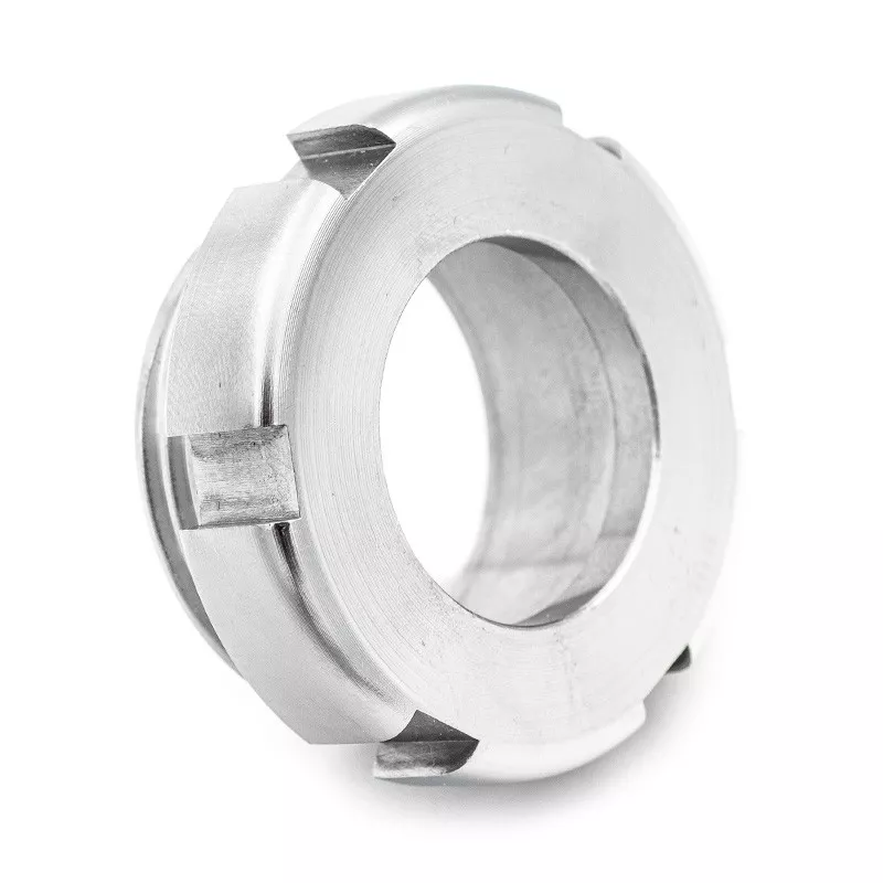 Ecrou mâle pour raccord aseptique 4 pièces, norme ISO, usiné en inox 304, pour raccords aseptiques 4 pièces utilisés dans les tuyauteries industrielles. Cette pièce doit être associée à un écrou ISO femelle pour former l'écrou complet.