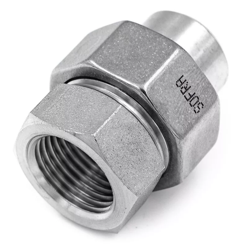 Raccord Union 3 pièces Série J06 combinant une pièce lisse, une pièce filetée femelle à filetage gaz, un écrou de serrage octogonal et un joint d'étanchéité plat en PTFE.