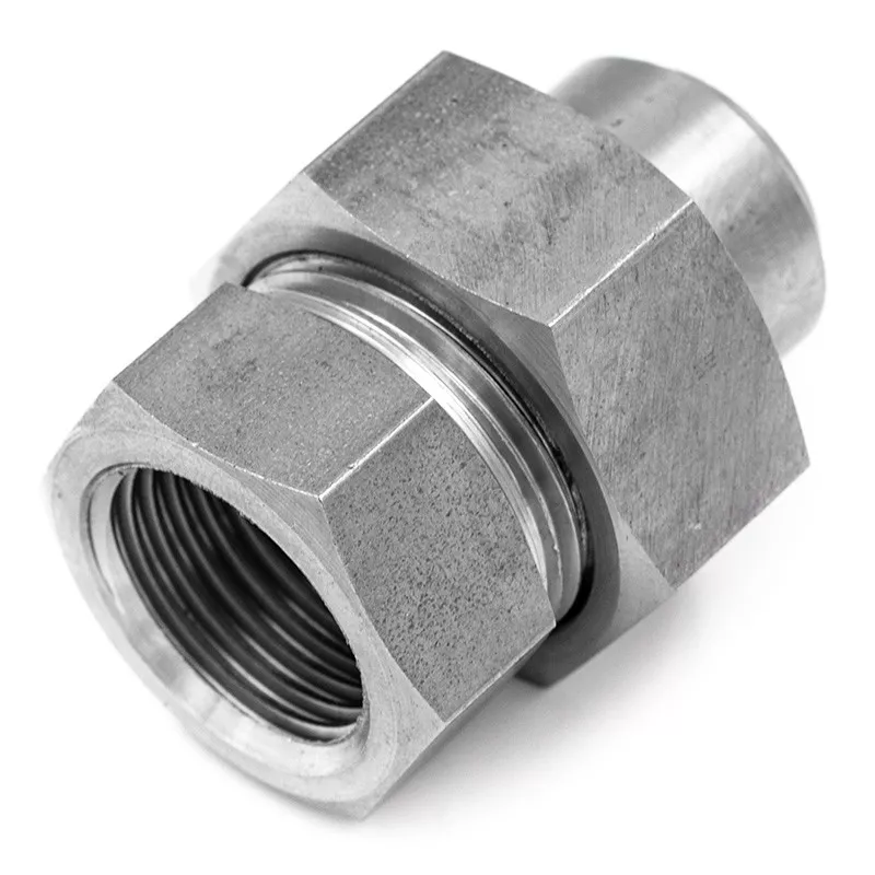 Raccord Union 3 pièces à jonction cône sur sphère, combinant une pièce lisse, une pièce filetée femelle (filetage gaz) et un écrou hexagonal en inox 316L. Ce raccord fabriqué en France est conforme à la norme EN 10272.