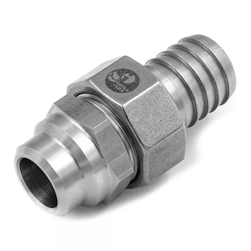 Raccord Union 3 pièces composé d'une pièce lisse et d'une pièce cannelée en inox 316L, d'un écrou de serrage octogonal moulé en inox 316 et d'un joint d'étanchéité en PTFE (téflon). Ce raccord utilisé dans l'industrie chimique est proposé du DN 8 au DN 50.