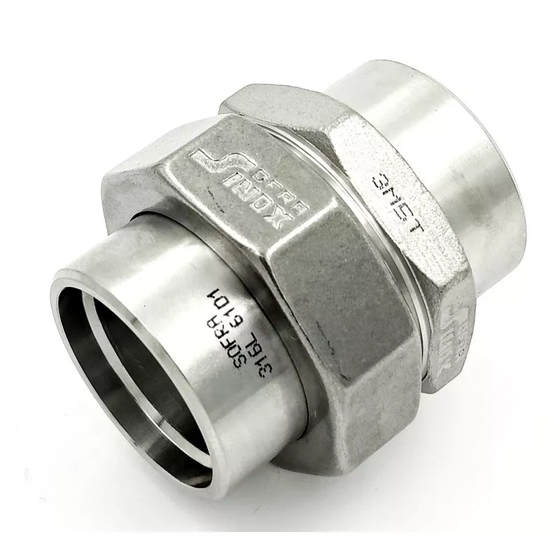 Raccord 3 pièces cône sur sphère faible épaisseur (1.6 à 2 mm), composé de 2 pièces lisses en inox 316L et d'un écrou de serrage octogonal. Ce raccord, 100% fabriqué en France par Beal Inox, est conforme à la norme EN 10272.