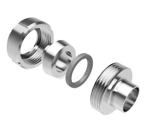 DIN 11851 hygienic fittings ensure a perfect seal thanks to the assembly of several stainless steel parts that completely enclose the semi-toric seal. A stainless steel DIN 11851 fitting consists of 4 parts: a welding liner, a male threaded part, a round notched nut and a D section seal (EPDM or NBR).