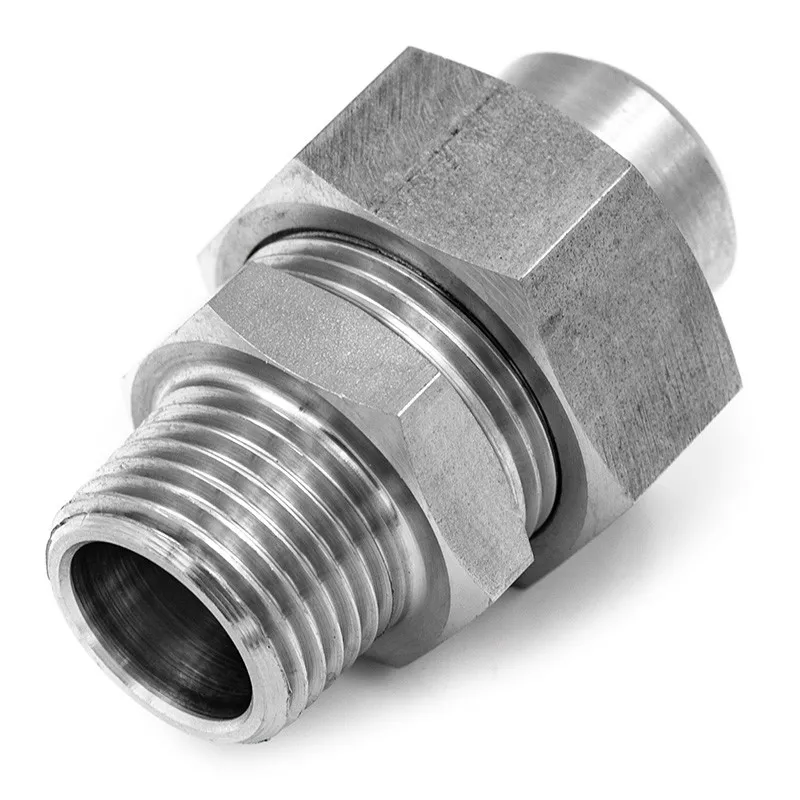 Three-piece union with conical connection consisting of a BW part, a male threaded part (NPT thread) and a hexagonal tightening nut, in stainless steel 1.4404.