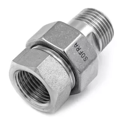 3-piece union consisting of a male threaded part (NPT thread), a female threaded part, an octagonal clamping nut and a PTFE flat seal.