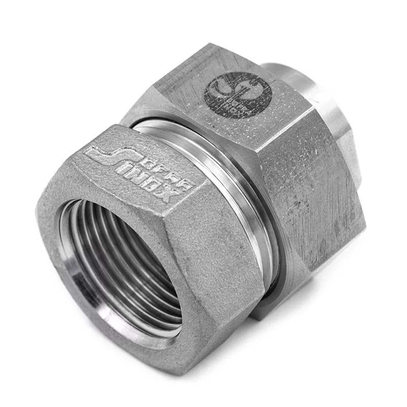 Reduced 3-pieces Union Fitting with two Female ends, machined in stainless steel 316L