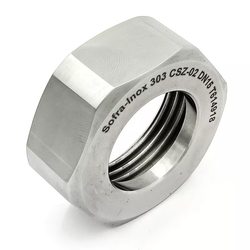 Hexagonal clamping nut for RJFR to ISO tube, full bore, in 303 stainless steel. This nut ensures the assembly of the threaded end and the smooth RJFR end.