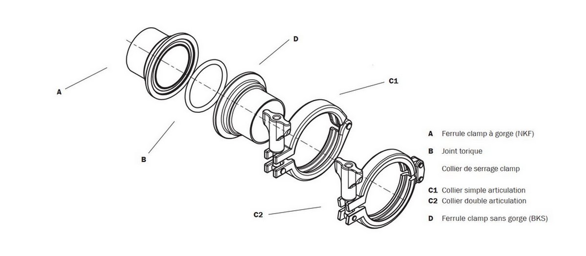 Les normes allemandes DIN 11864/11853 concernent les robinetteries en acier inoxydable utilisées en milieux aseptiques, dans l'industrie chimique et pharmaceutique. Dans cette famille, le type 3 concerne plus particulièrement les raccords à serrer aseptiques, disposant d'un collier de type Clamp. Les raccords à Forme A présentent une gorge pouvant accueillir un joint torique (section en O). Le joint est logé entre la ferrule mâle et la ferrule femelle.