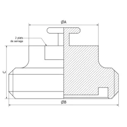 Ce bouchon fileté accueille un joint d'étanchéité à section carrée, et il est associé à une pièce lisse et à un écrou de serrage. Il possède deux sections plates pour faciliter le serrage.