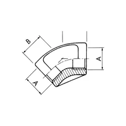 Coude à 45° moulé en inox 316, à extrémités femelle-femelle, filetage gaz, pour tuyauterie industrielle.