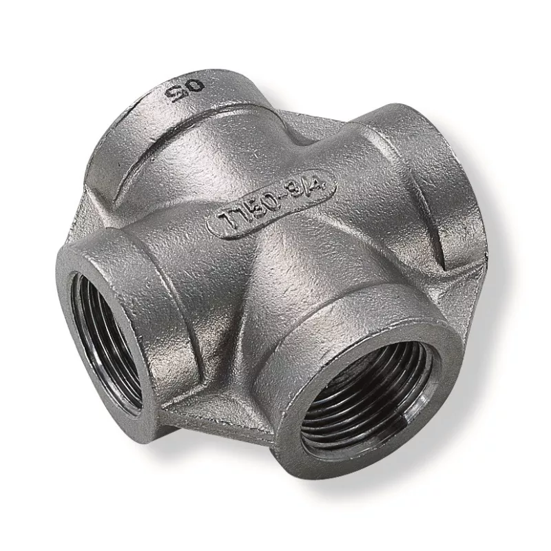 Croix moulée en inox 316, à extrémités femelles, à filetage gaz, pour les tuyauteries industrielles.