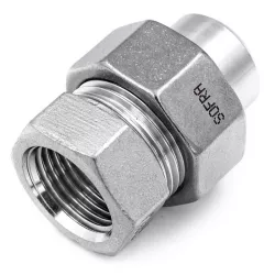 Raccord Union 3 pièces, composé d'une pièce lisse, d'une pièce filetée mâle et d'un écrou octogonal en inox 1.4409. Ce type de raccord n'utilise pas de joint d'étanchéité.